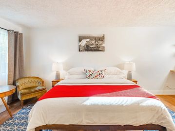Relax and recharge in this quaint cottage. It has a bedroom with queen bed and sliding barn door and a small sitting room. Includes a compact full bath, mini-frig, microwave and electric tea kettle. No air conditioning (fan is provided).