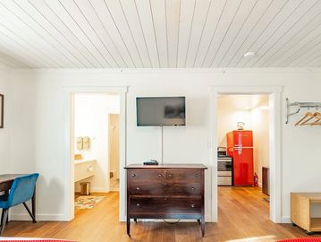 A cozy room perfect for two! It includes a queen bed, full bath, mini-frig, microwave and electric tea kettle. No air conditioning (fan is provided).